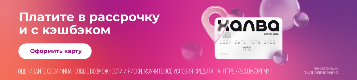 *Карты рассрочки "ХАЛВА", "СОВЕСТЬ" - это продукты, предоставляемые ПАО "Совкомбанк" (геню лицензия Банка России №963 от 05.12.2014г.). Поэтому решение о предоставлении кредита и выдаче карты выносит именно банк самостоятельно.