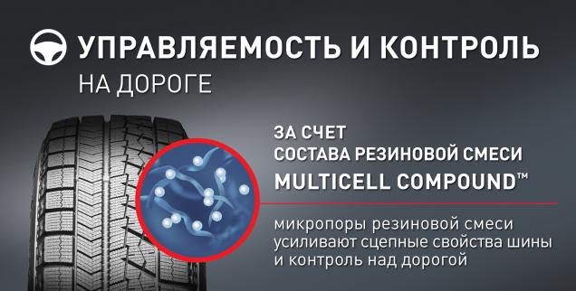 Достигается за счет резиновой смеси Multicell CompoundTM, которая усиливает сцепные свойства шины. Подходят для самых сложных зимних дорог.