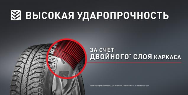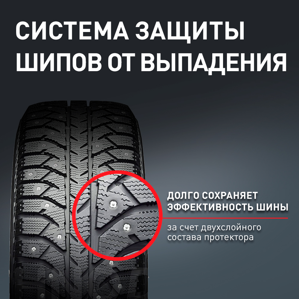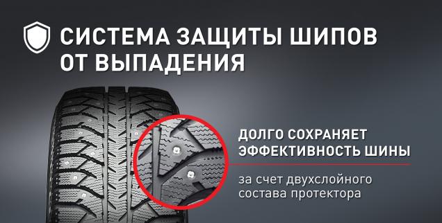 Достигается за счет двухслойного состава протектора, который обеспечивает надежное крепление шипов в протекторе.