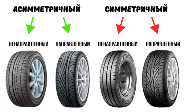 • Направленные асимметричные. В изделиях с несимметричным узором протектора рабочая поверхность поделена на две или три зоны, каждая из которых работает в определенных условиях. Например, внутренние плечевые секции, как правило, более адаптированы к мокрым покрытиям, а наружные — к заснеженным.